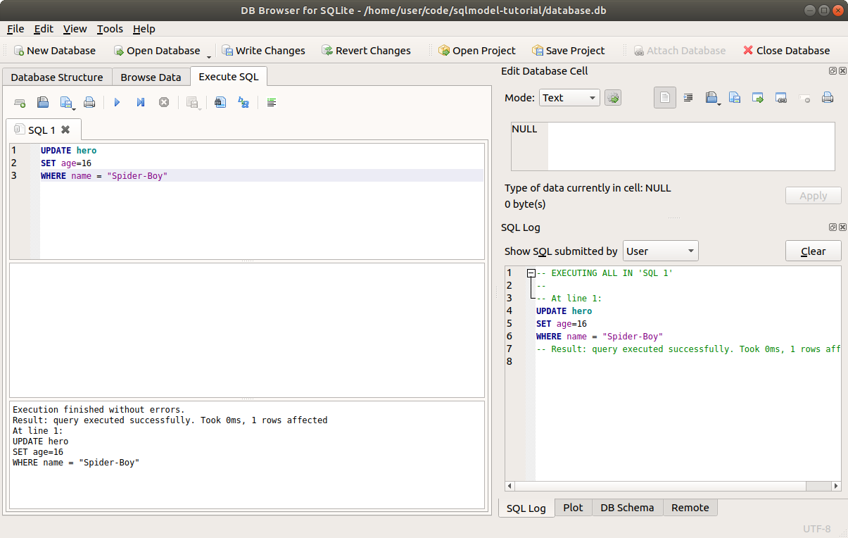 Execute the select statement. This generates the output: INFO Engine BEGIN (implicit) INFO Engine SELECT hero.id, hero.name, hero.secret_name, hero.age FROM hero WHERE hero.name = ? INFO Engine [no key 0.00020s] ('Captain North America',)Tip See the BEGINat the top?This is SQLAlchemy automatically starting a transaction for us. This way, we could revert the last changes (if there were some) if we wanted to, even if the SQL to create them was already sent to the database.